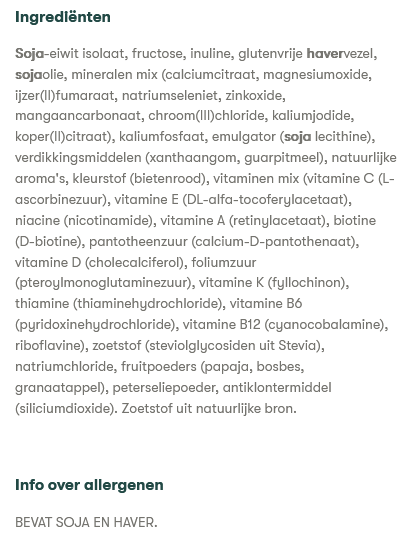 Indien bereid met 2 maatscheppen PDM (of PDM Vegan) en 300 ml water, bevat één portie: